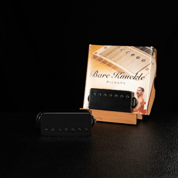 Bare Knuckle Pickup’s Ragnarok 7-String Set with satin Black Covers and Black Screw poles. Misha Mansoor’s Signature pickup set. This set features a 4 conductor wiring, tri-tab feet, and a reversed magnet in the neck (for pairing inner and or outer coils when tapping). This set has quickly become a favorite of ours. The bridge has a massive bottom with enough top end to still cut through. The voicing is aggressive, the response is articulate and fast. If you like the Warpig’s massive and thick sound and extreme output, you’ll find yourself right at home with the Ragnarok. The Ragnarok offers a more compressed feel and sound with a little more top end and less focus on the low mids. The Neck pickup is balanced and the ceramic magnet works out great for piling on layers of reverb and ambient delays without losing the note’s attack.