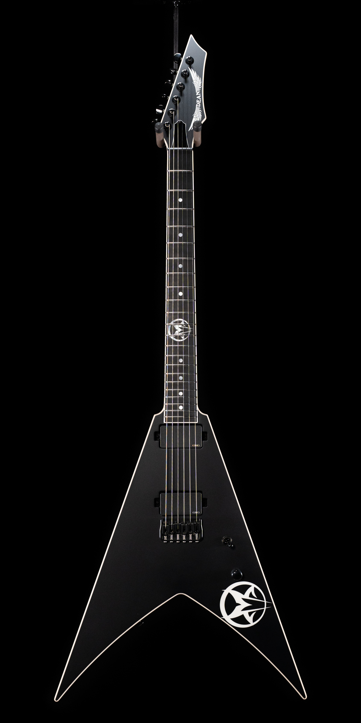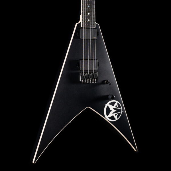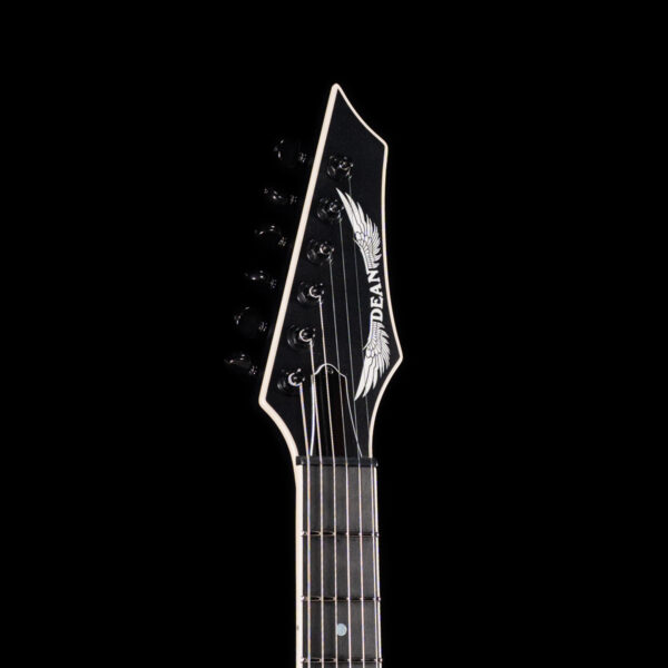 From the mind and the hands of one of the most innovative guitarists in contemporary metal; Greg Tribbett teamed up with Dean to create a guitar that is the perfect balance of class and performance. A solid mahogany body and a 3pc maple neck allow this guitar to have a wide range of resonance and the ability to stop on a dime. Ebony fingerboard with 22 jumbo stainless frets and a Pearl Mudvayne logo on the 12th fret not only bring out the bold appearance but sustain the rigors of the road. Loaded with the classic EMG 81/85 active pickups (which started it all) and a USA Hipshot hardtail bridge to bring this all together for the fan of the perfect guitar insane riffing, lead playing, and durability. A sleek black satin finish with fully white bound body, neck, and headstock ties it all in with the matching Mudvayne logo on the body for total aesthetic balance and ferocity. Hardshell case included.