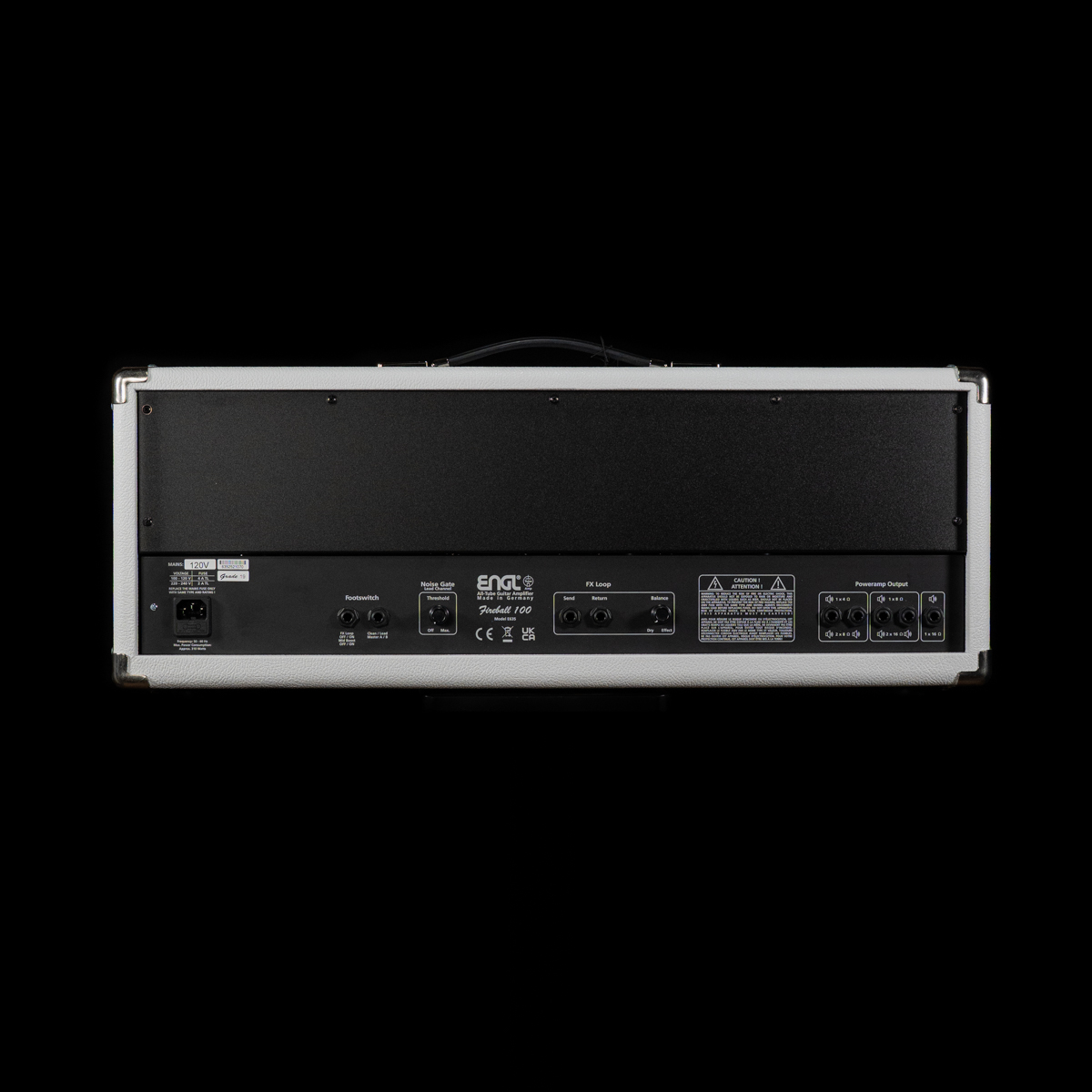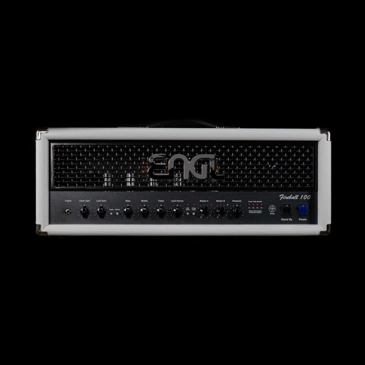 ENGL Fireball 100 6L6 100w Tube Head in a custom White Tolex with Blue LEDs and Blue Power Switch.