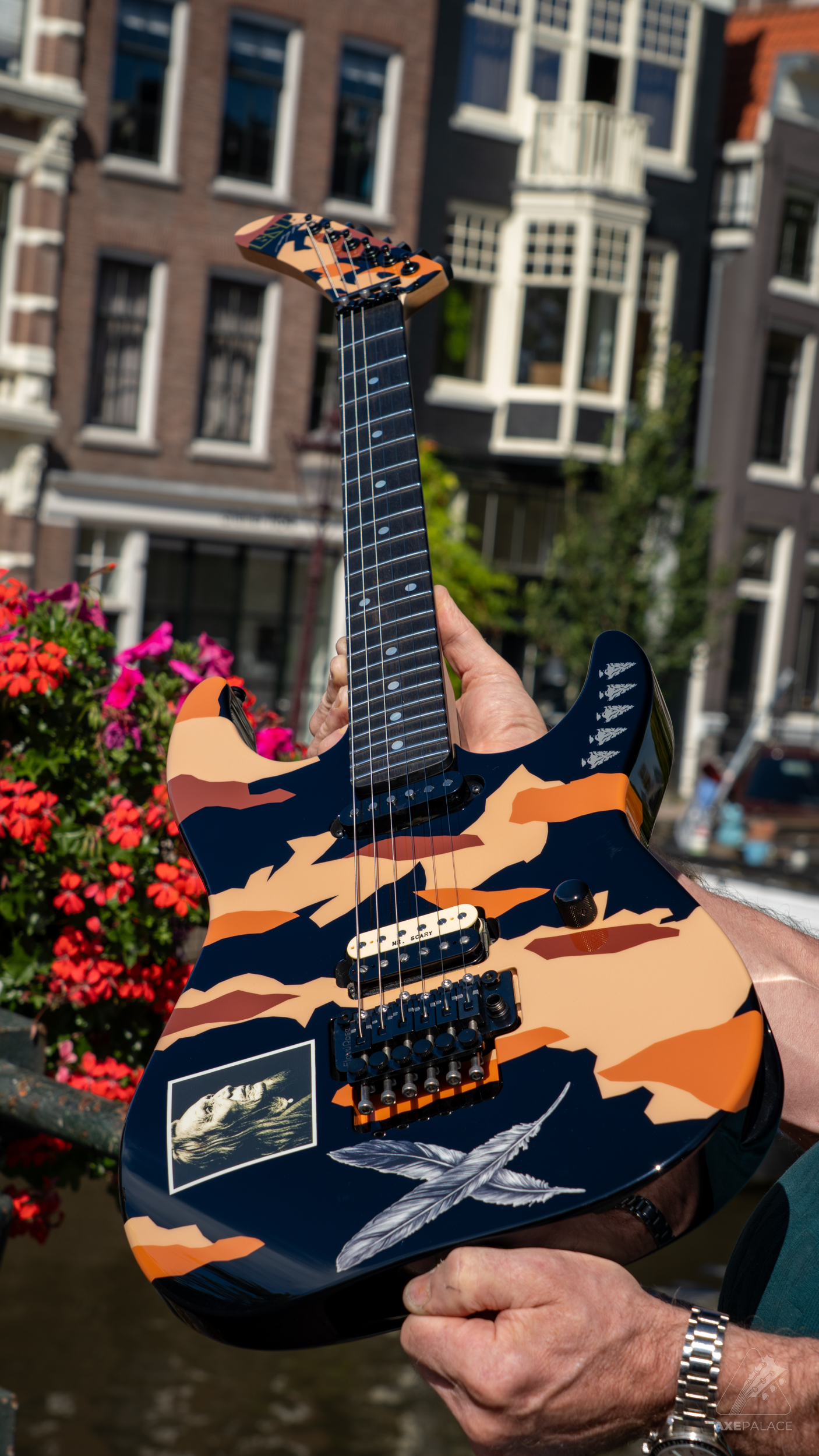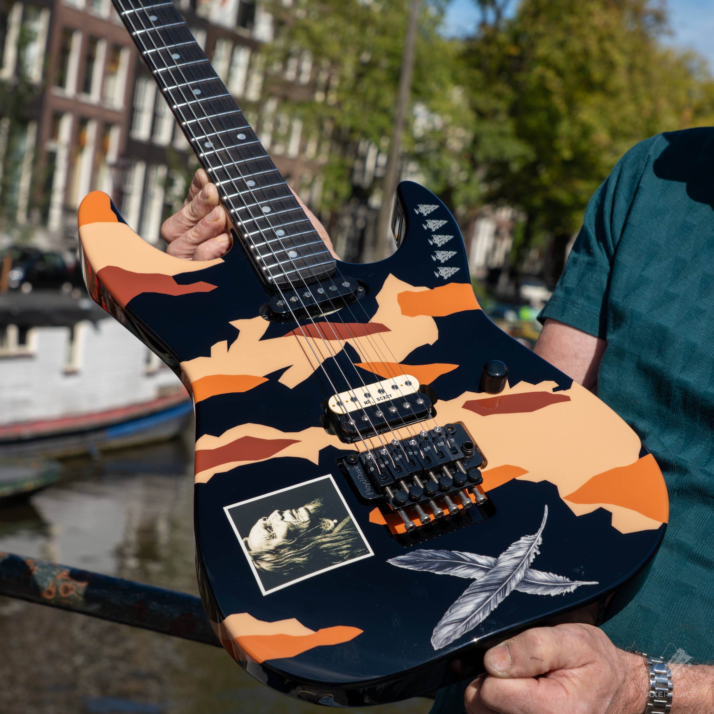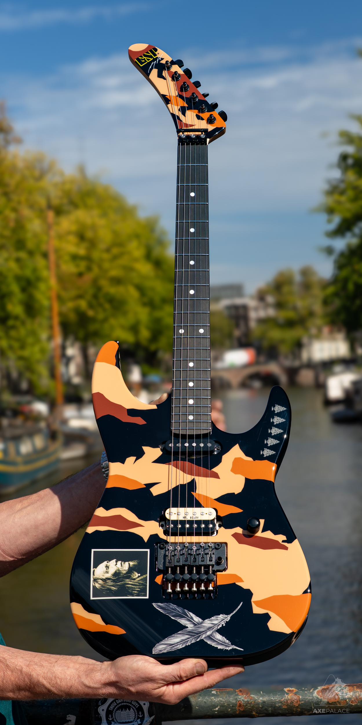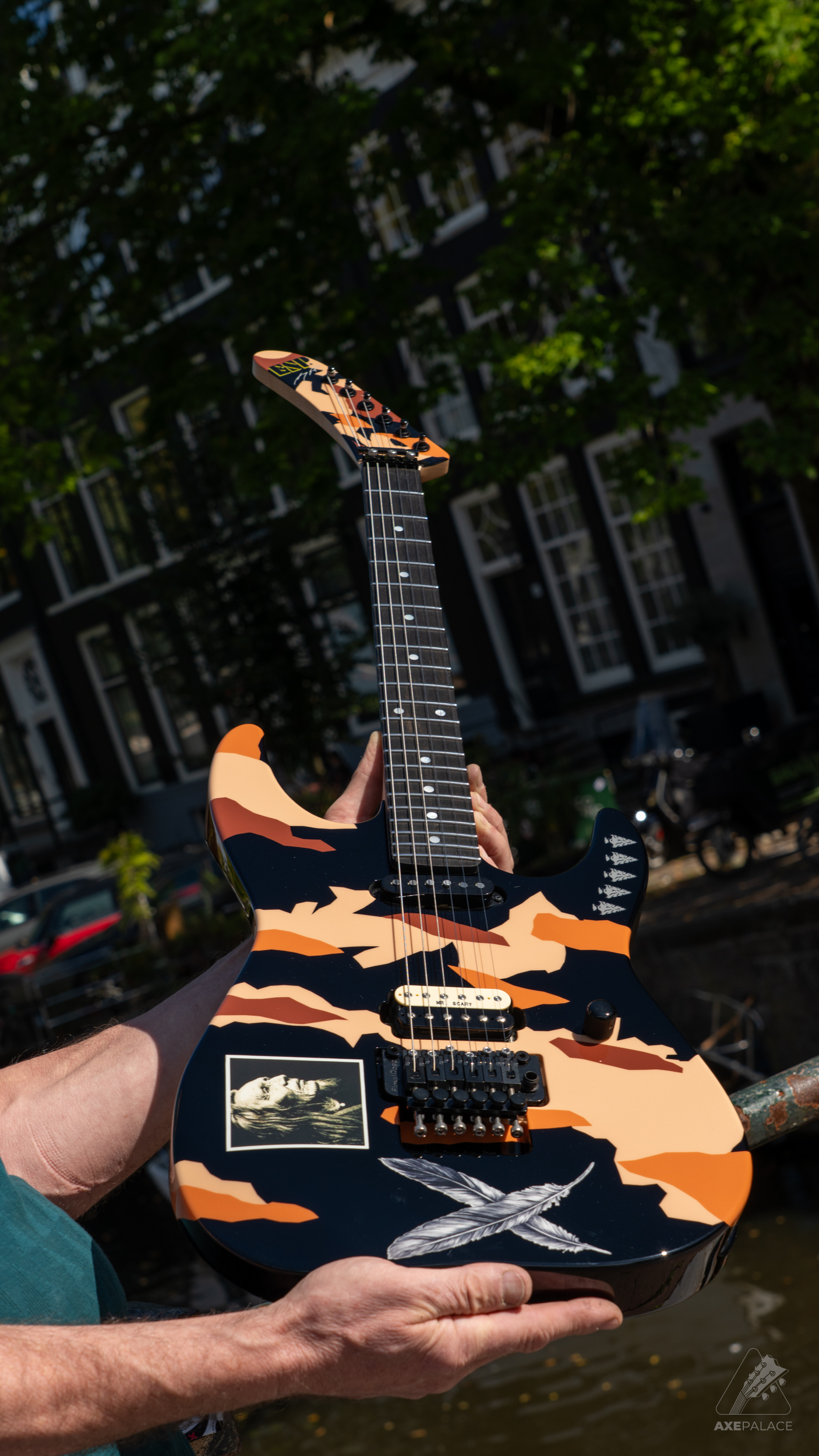 This guitar, an evolution of George’s legendary Kamikaze guitar, is a striking design that has a graphic theme accented by double feathers and arrow heads. Like most of George’s personal custom shop models, the ESP GL Desert Eagle offers a maple body, which provides both a fast attack and a clear, bright sustain. It also includes a bolt-on maple neck at 25.5” scale, profiled to George’s original U shape, with an ebony fingerboard, dot position markers, and 22 extra-jumbo stainless steel frets.