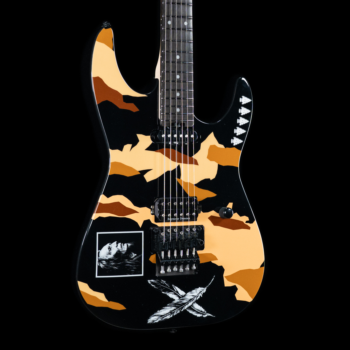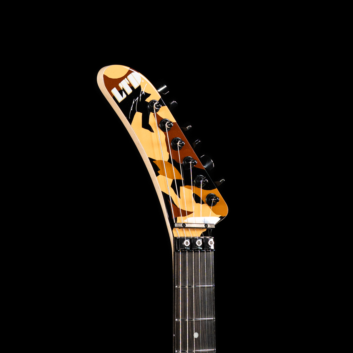 George Lynch is one of the world’s most respected and influential guitarists, and was one of the very first ESP Signature artists to join our company back in the 1980s. The LTD GL Desert Eagle is a re-imagining of his famous Kamikaze model. It features an alder body and maple neck, joined with bolt-on construction at 25.5” scale. The Kamikaze’s kanji characters and bombs have been replaced by double feathers and arrow heads in this striking design, which offers subtle black binding on the body.