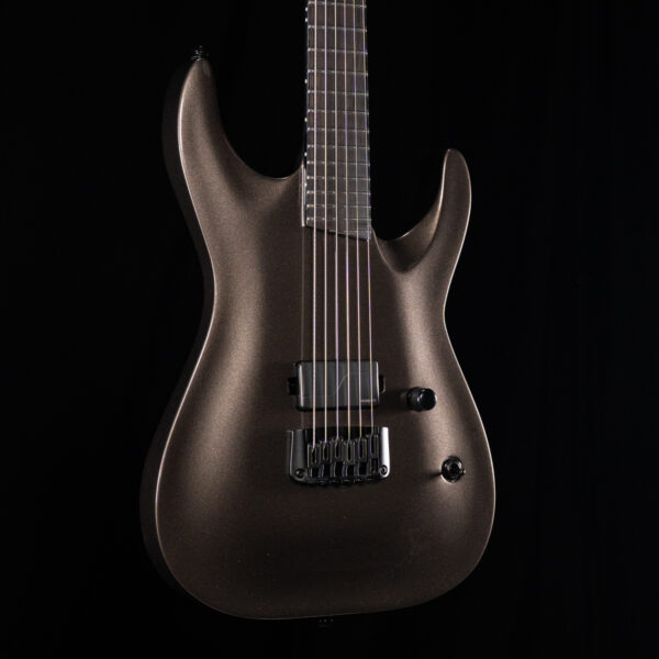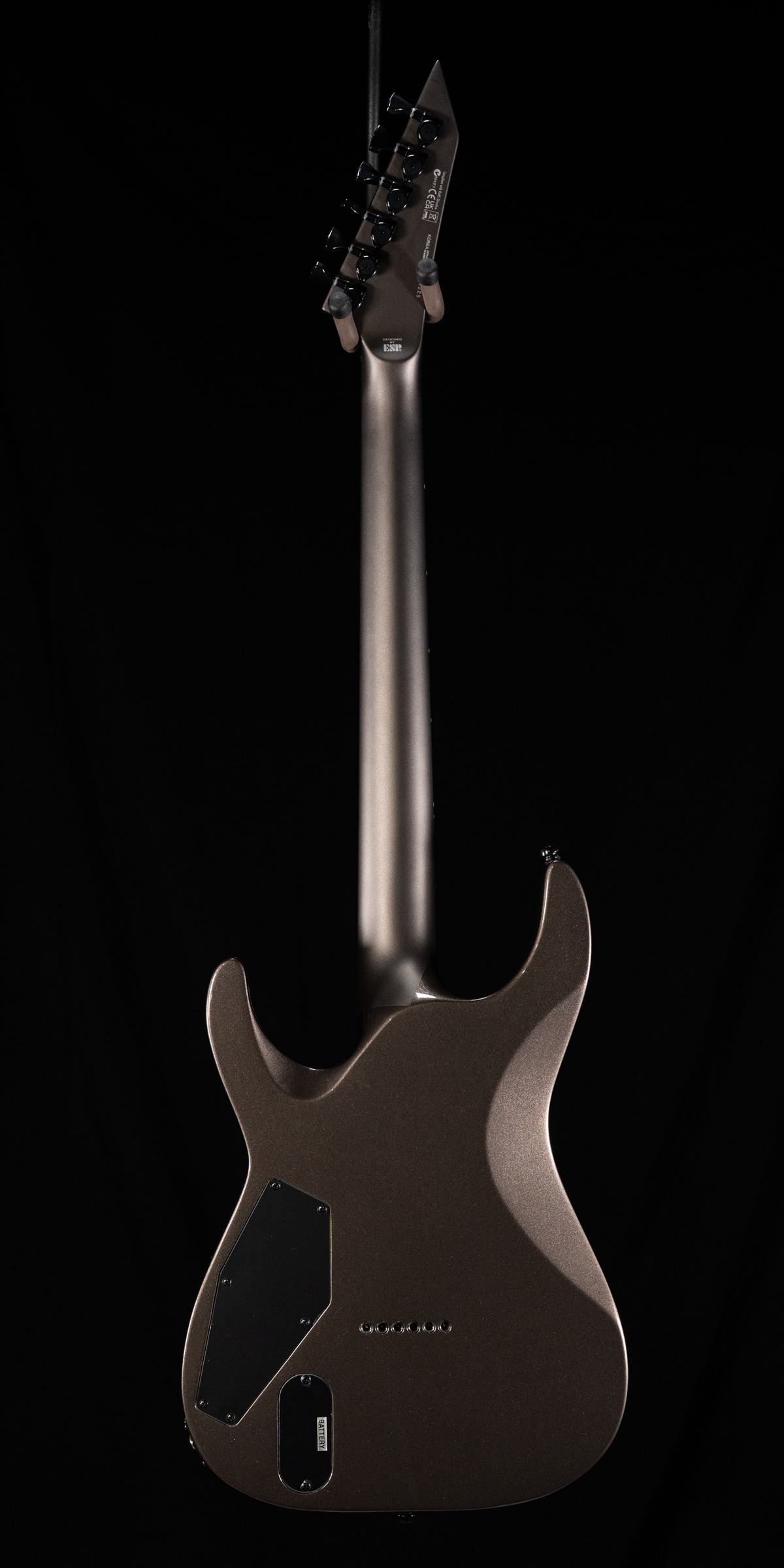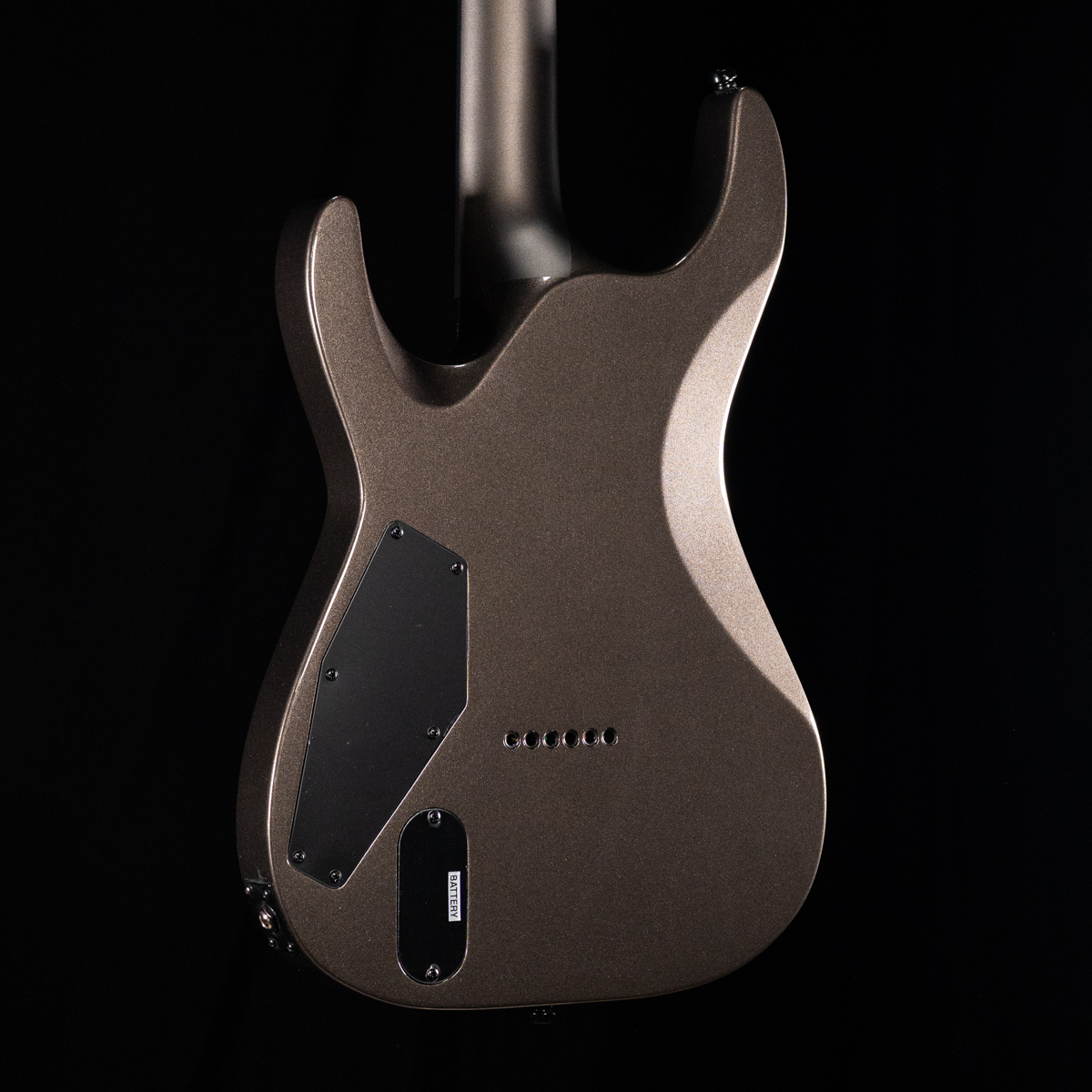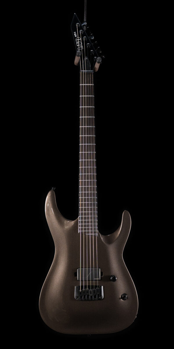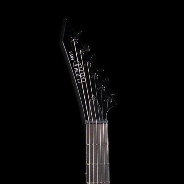 The LTD MT-I in Obsidian Metallic finish features set-thru construction at 25.5” scale, a mahogany body with white ash top, a three-piece maple neck, Macassar Ebony fingerboard with compound radius and 24 medium-jumbo stainless steel frets, a Graph Tech Black TUSQ XL nut, Hipshot Grip-Lock locking open gear tuners, Hipshot Hi-Mass hardtail bridge, blue Luminlay side markers, and a Fishman Fluence Mick Thomson Signature pickup with a 3-way toggle switch and push/pull volume to control voice selection. Includes ESP hardshell form fit case.