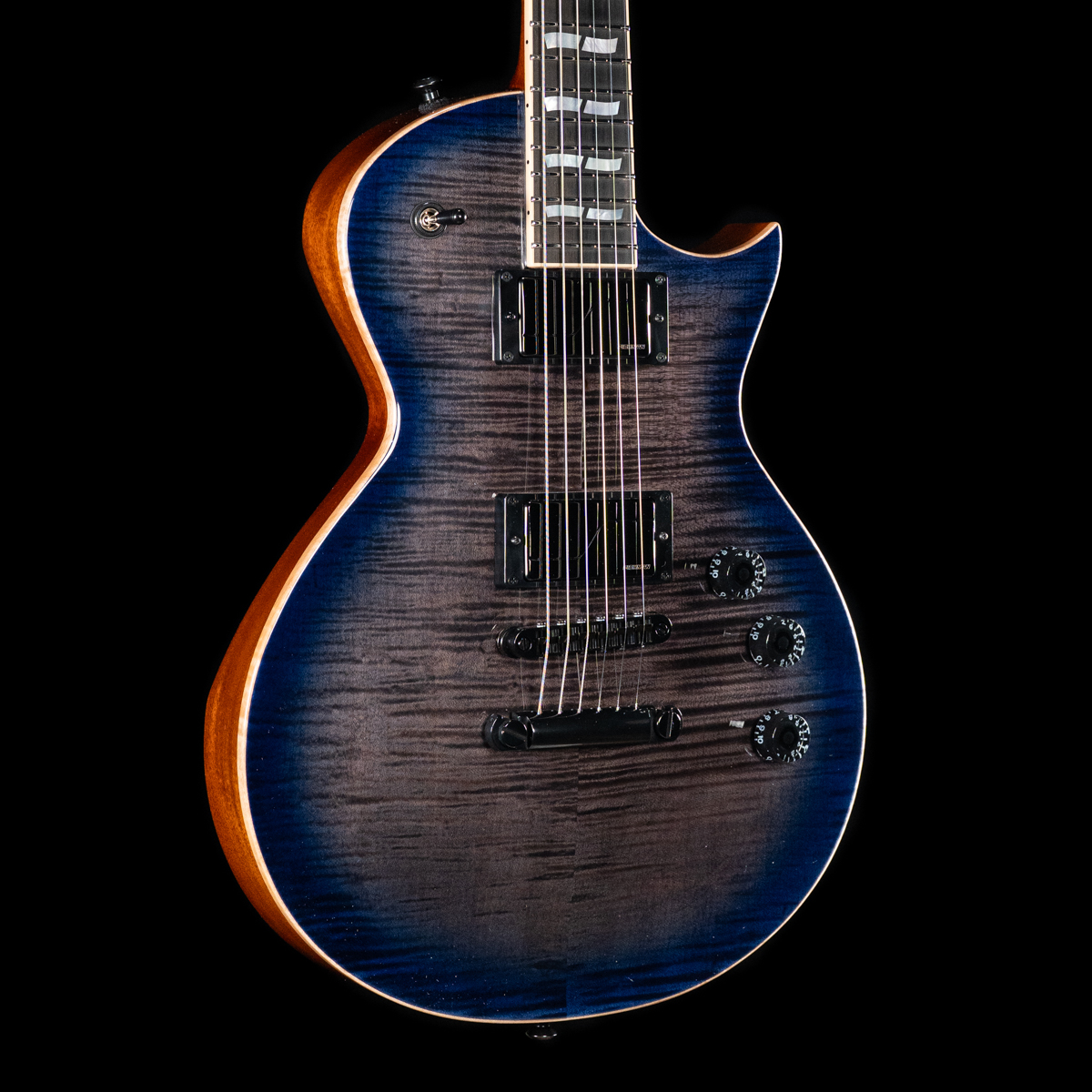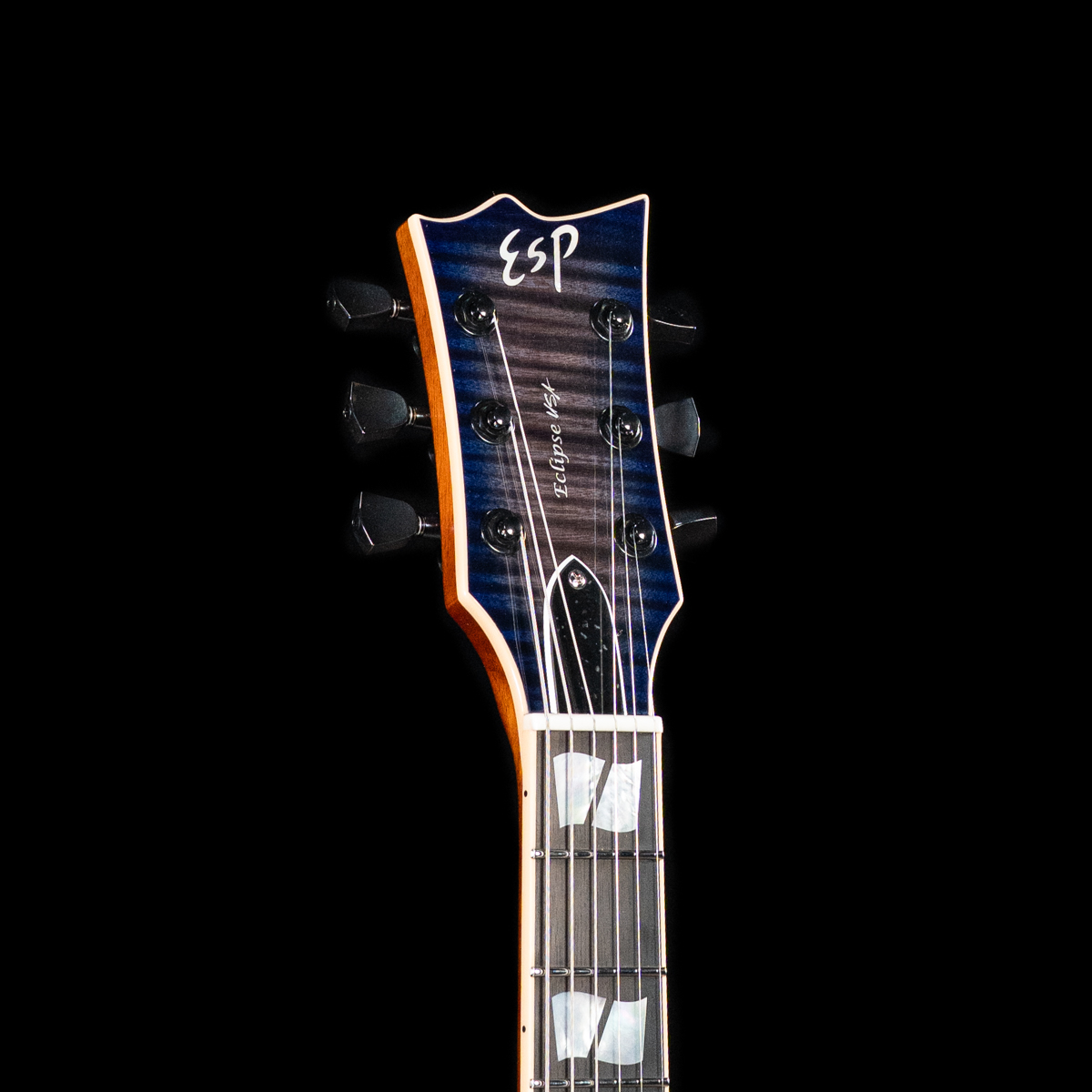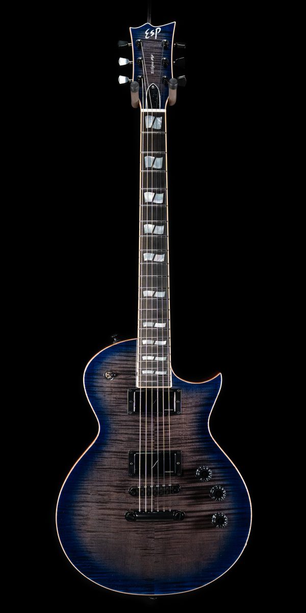 It features a full-thickness mahogany body (60mm / 2 3/8”), strategically weight relieved. It stuns with a flame maple top in ESPs “Blue Moon” finish. It is built at classic 24.75” scale using set-thru construction for smooth access to the higher frets, using a three-piece thin U-shaped mahogany neck and ebony fingerboard with 22 extra-jumbo Jescar stainless steel frets and mother-of-pearl split-flag inlays.