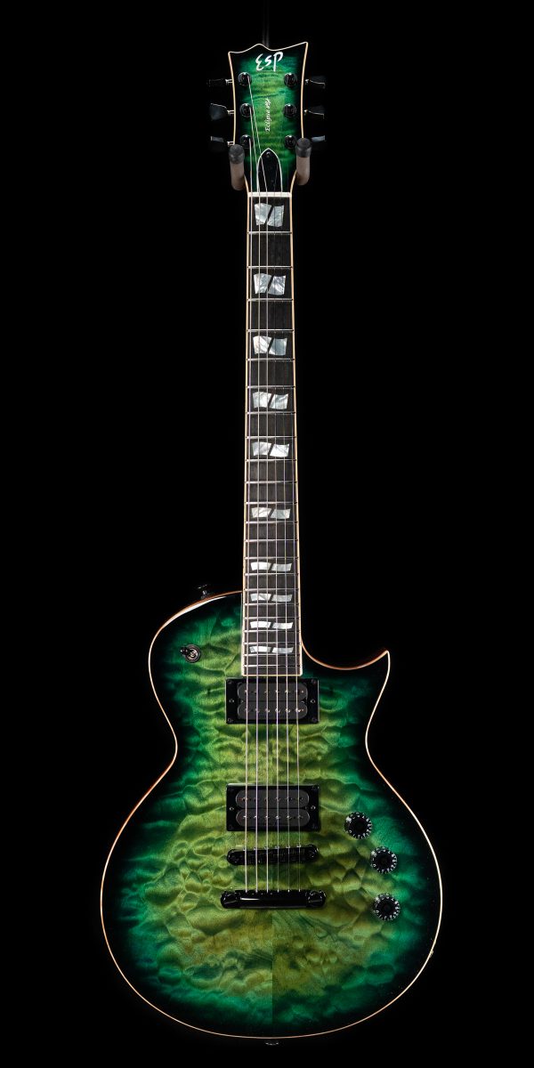 It features a full-thickness mahogany body (60mm / 2 3/8”), strategically weight relieved. Its got dazzling quilted maple top in ESPs “Dark Lime Sunburst” finish. It is built at classic 24.75” scale using set-thru construction for smooth access to the higher frets, using a three-piece thin U-shaped mahogany neck and ebony fingerboard with 22 extra-jumbo Jescar stainless steel frets and mother-of-pearl split-flag inlays.