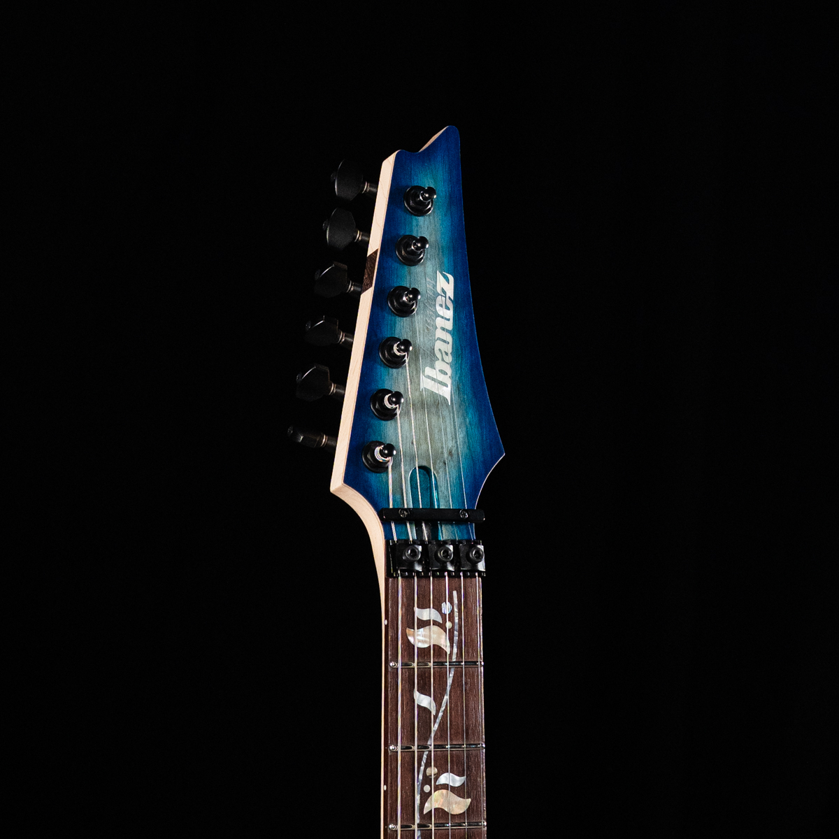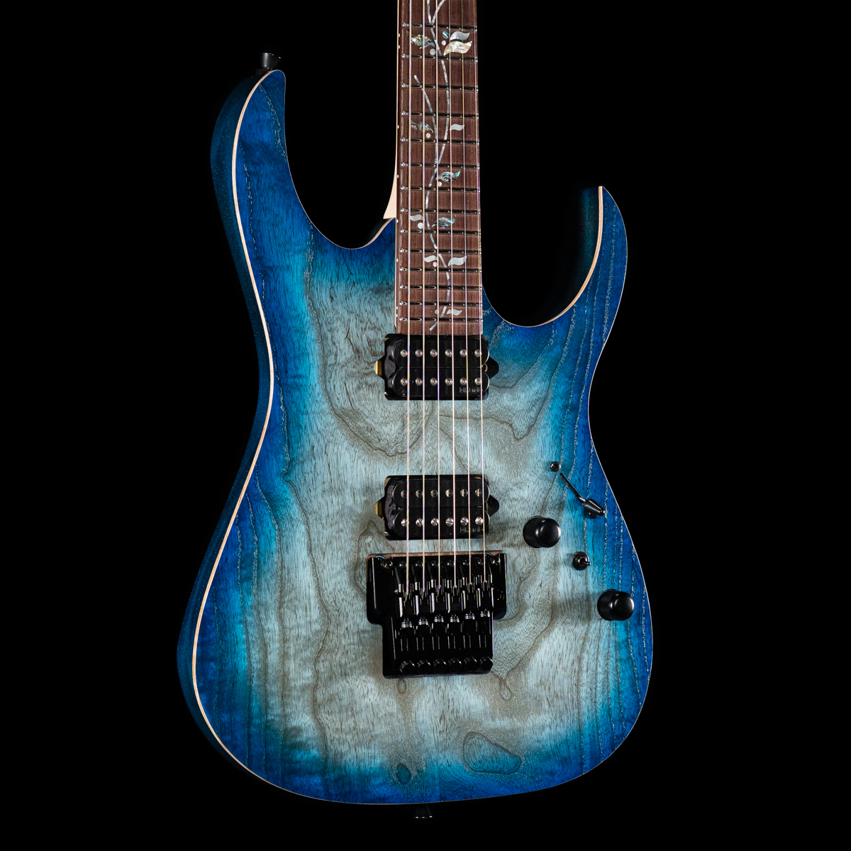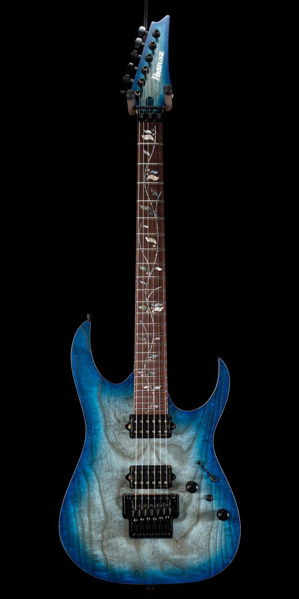 The RG8620AH features a 4mm thick ash top with binding on an African mahogany body bolted to a maple and wenge neck with an ultra thin Super Wizard asymmetric profile, a matching headstock, and a rosewood fingerboard with 24 umbo frets, abalone & mother of pearl Tree of Life inlays, and Luminlay side dots. Components include a pair of DiMarzio humbucking pickups, a Lo-Pro Edge double locking tremolo bridge, Gotoh SG381 machine heads, and Gotoh Strap Locker pins. The hardware is satin black. A hardshell case and certificate of authenticity are included.