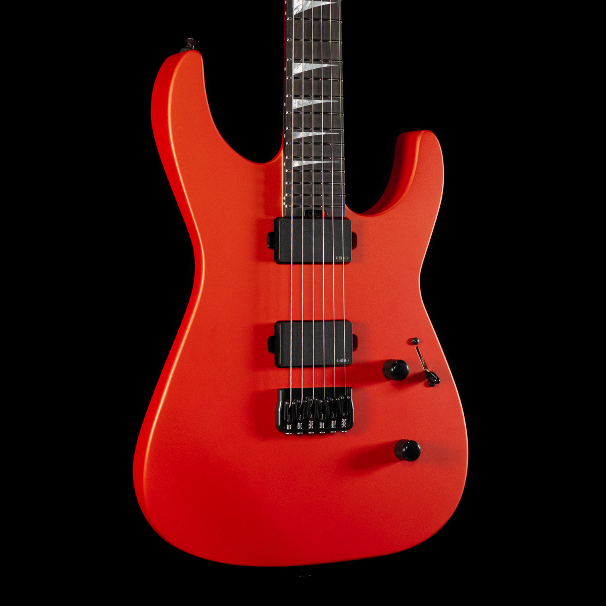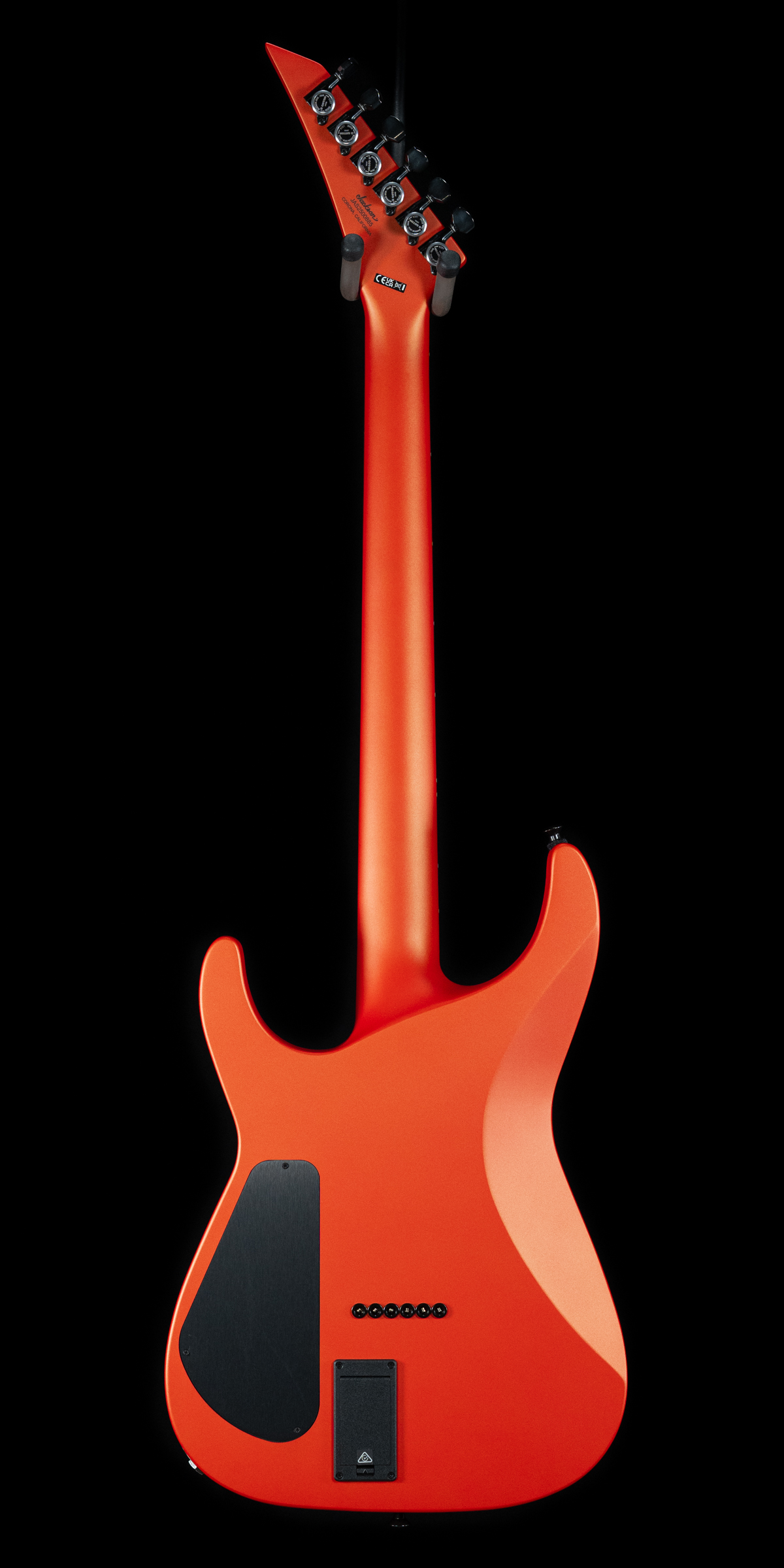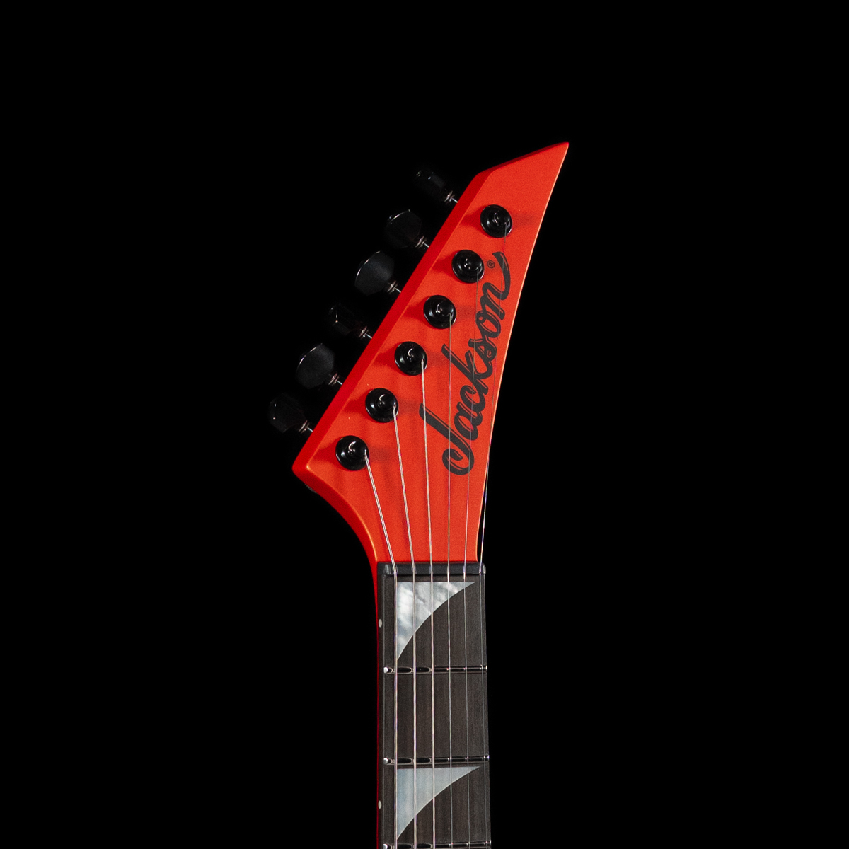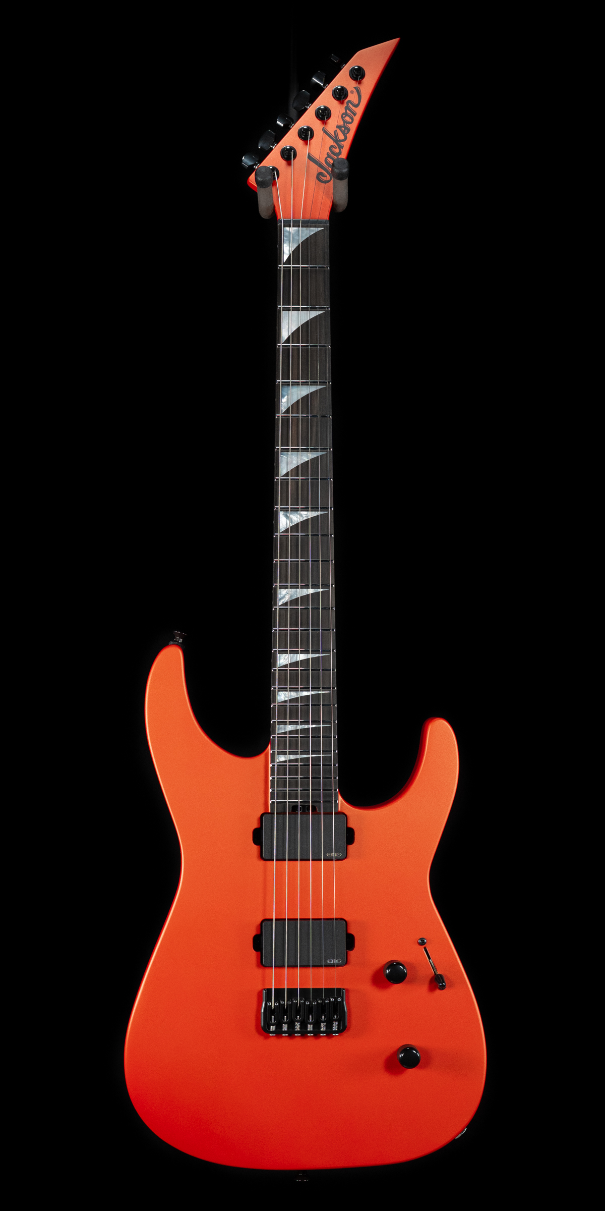 The Jackson American Series Soloist SL2MG HT Limited Edition – Satin Lambo Orange is a U.S.-made, fixed-bridge superstrat built for precision, stability, and playability. It features an alder body with a neck-through three-piece maple neck reinforced with graphite, topped with a 24-fret ebony fingerboard and a 12″–16″ compound radius for smooth playability across the neck. The stainless-steel jumbo frets, inverted mother-of-pearl sharkfin inlays, and Luminlay® side dots highlight its professional-grade build.
