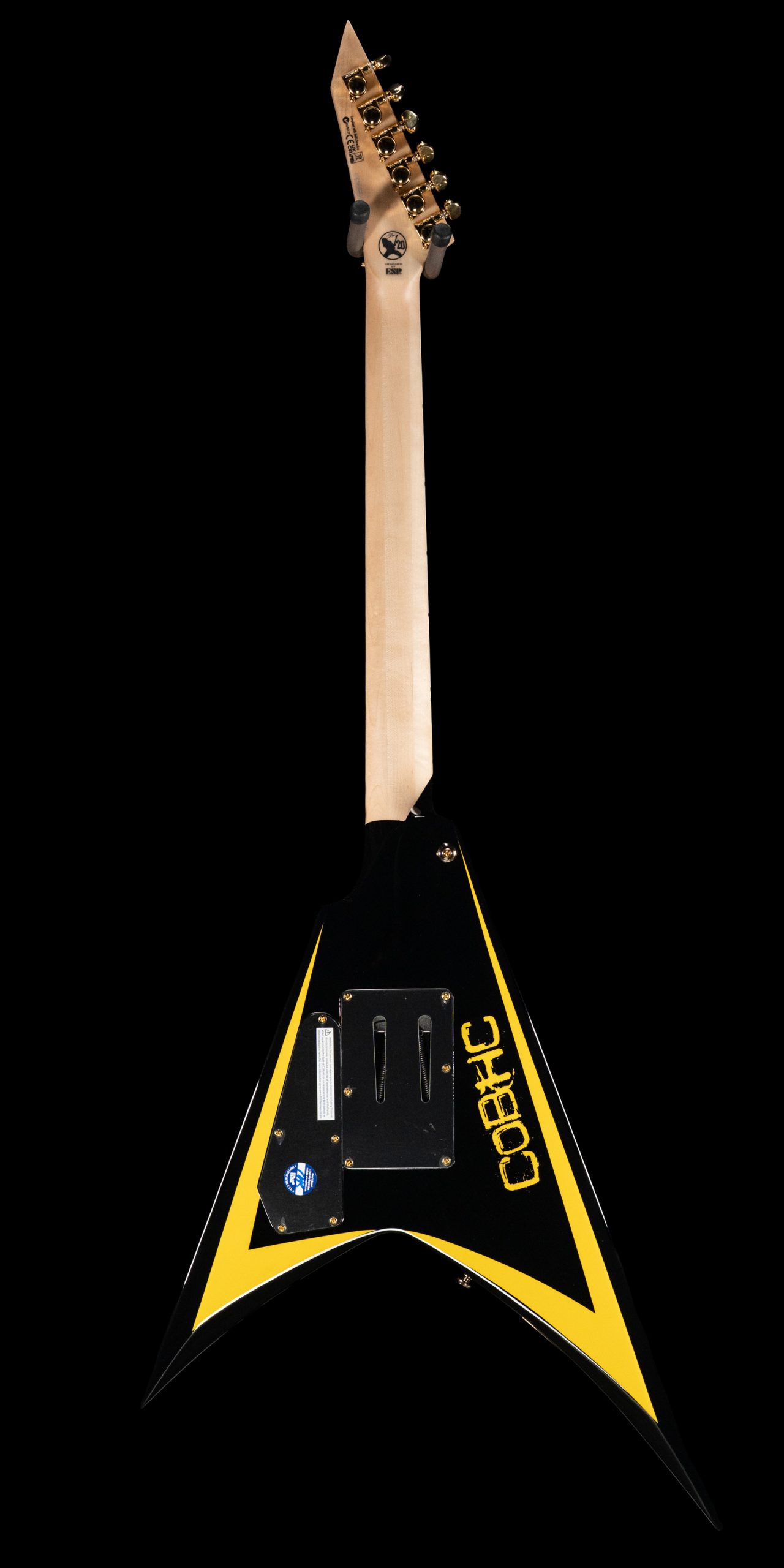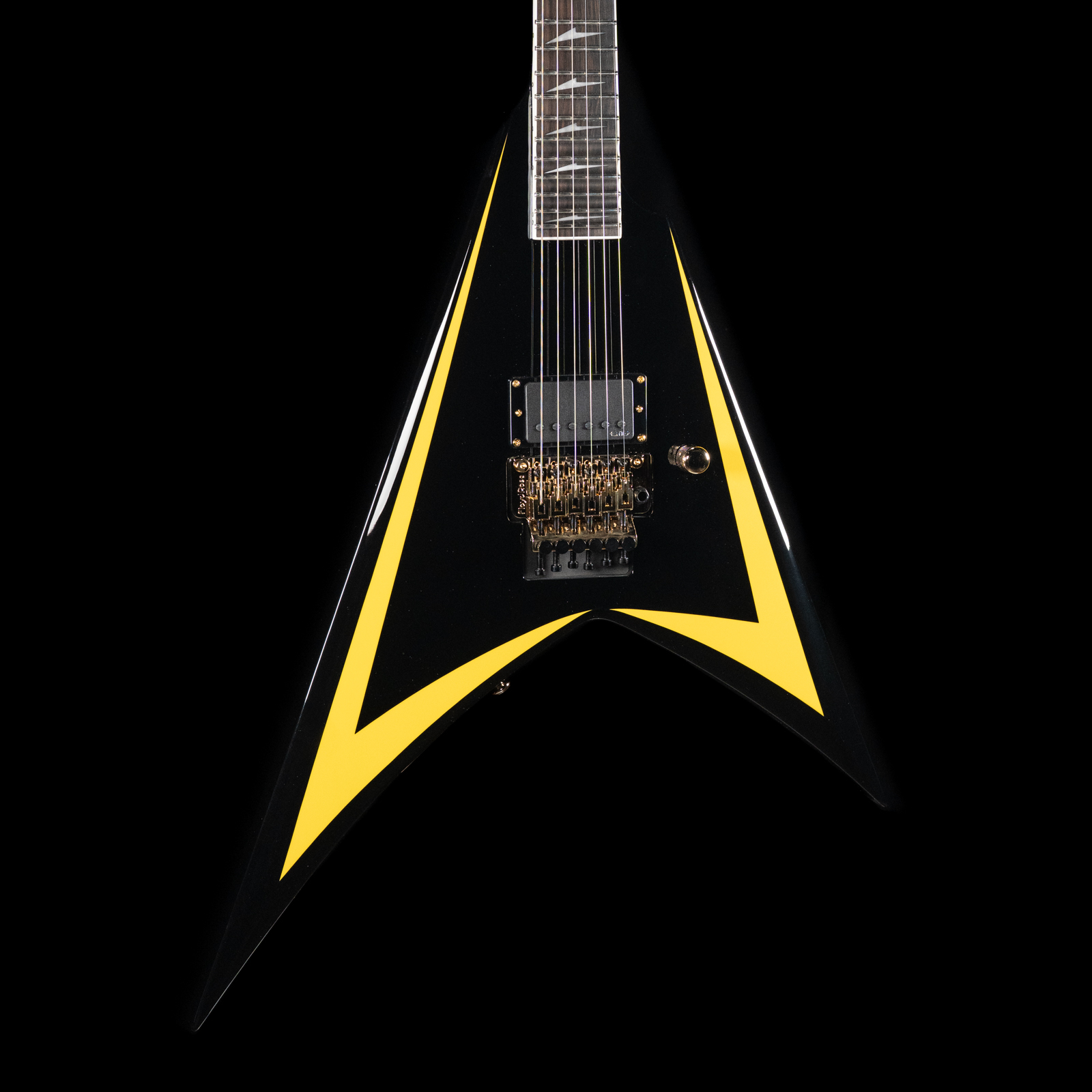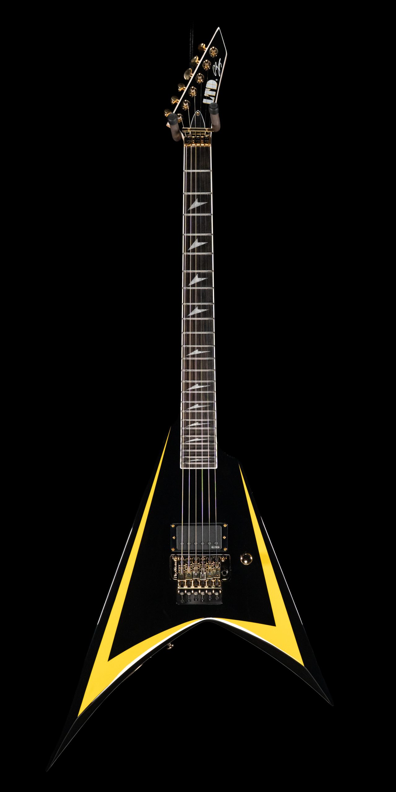 The ESP LTD Alexi Arrowhead SE is exactly what you’d expect from a guitar tied to Alexi Laiho’s legacy—fast, aggressive, and built with zero compromises. The offset V shape with its black finish and yellow pinstripes is instantly recognizable, but this isn’t just about aesthetics. It’s a purpose-built instrument designed around speed, precision, and control, staying true to the feel and response that defined Alexi’s playing.