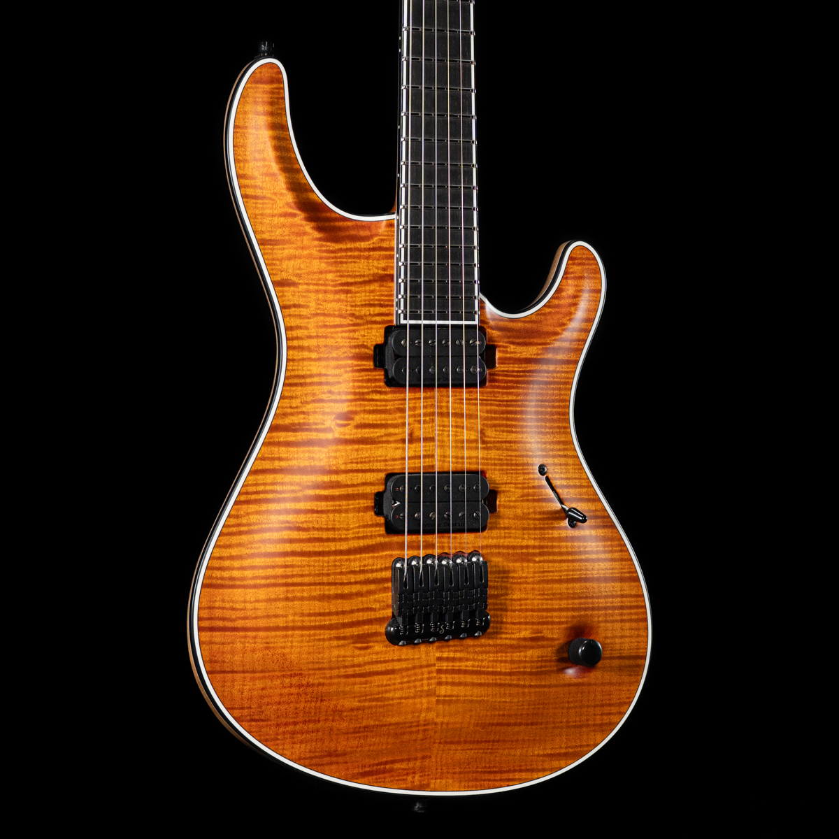 Mayones Regius Core 6-String with a 5A Flame Maple Top, Transparent Orange Satin finish, Neck-thru “Exotic-1” 11-ply Mahogany-Maple-Purpleheart-Wenge neck, Black Limba body Ebony Fingerboard, Schaller Hannes bridge, Seymour Duncan Pegasus/Sentient pickups, 24 Stainless Steel frets, Luminlay side dots, and so much more.