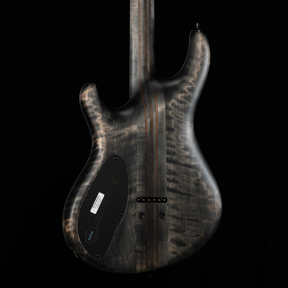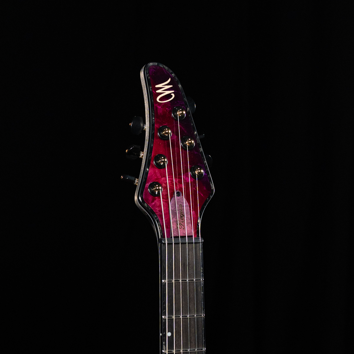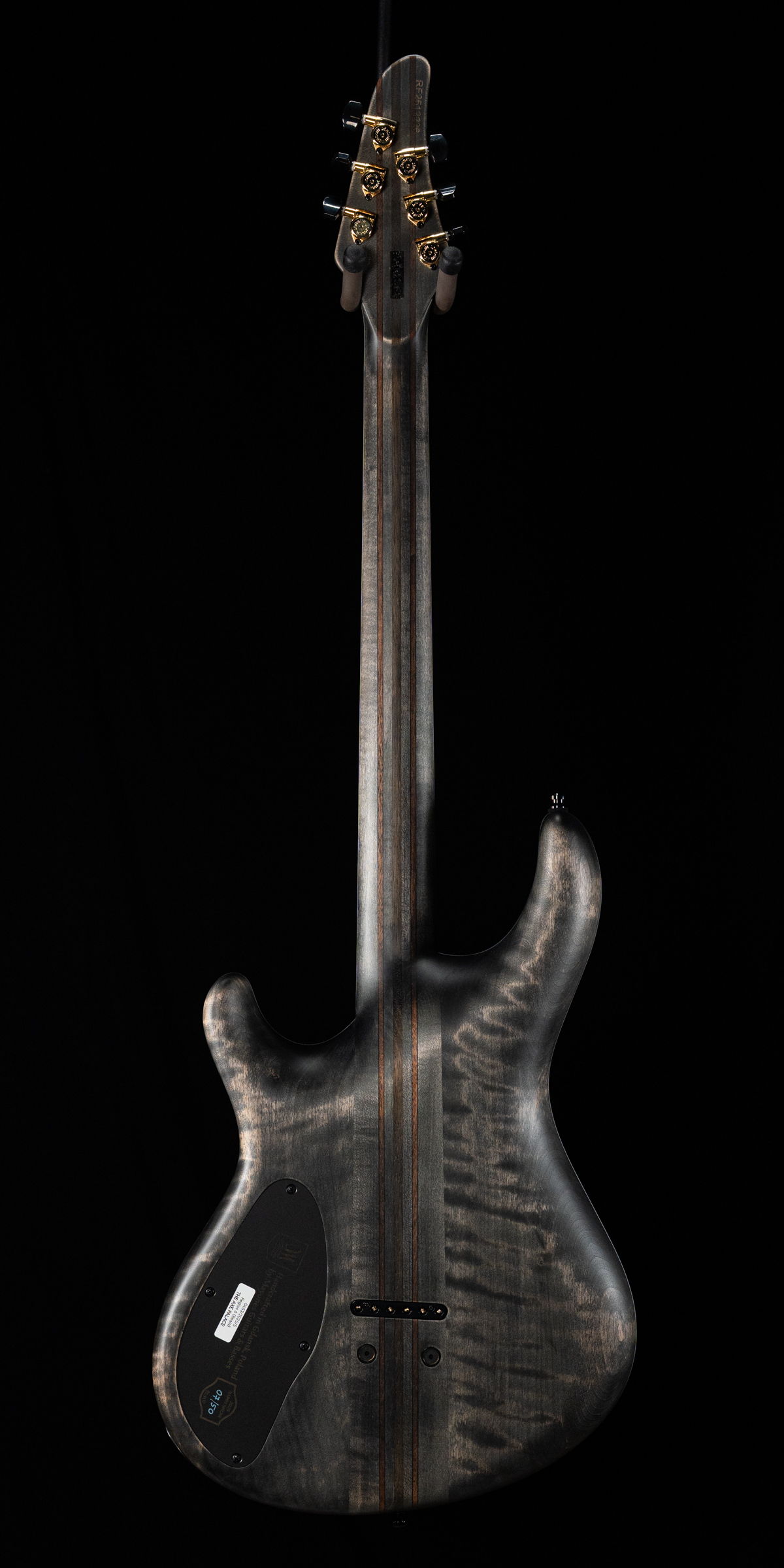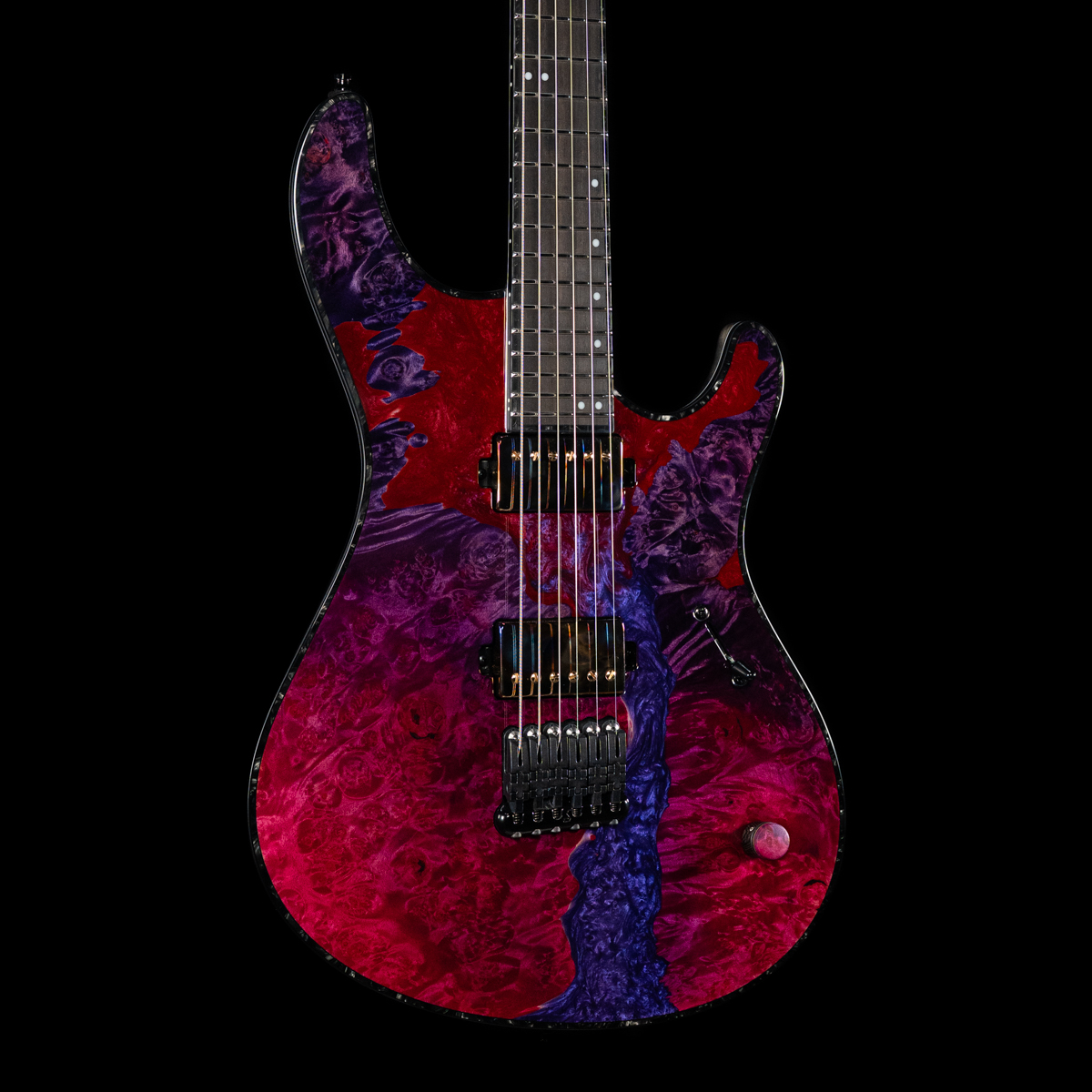 This masterpiece also features an all-ply Maple/Mahogany/Wenge/Amazakoe neck, Ebony fingerboard, 24 Stainless Steel frets, thin C shape neck, blue Luminlay side dots, Velvetrone pickups, Schaller Hannes bridge, Hipshot locking tuners, hybrid Black/Gold hardware, 3-ply black/black pearloid binding, 5-way selector switch, and of course a stunning custom finish.